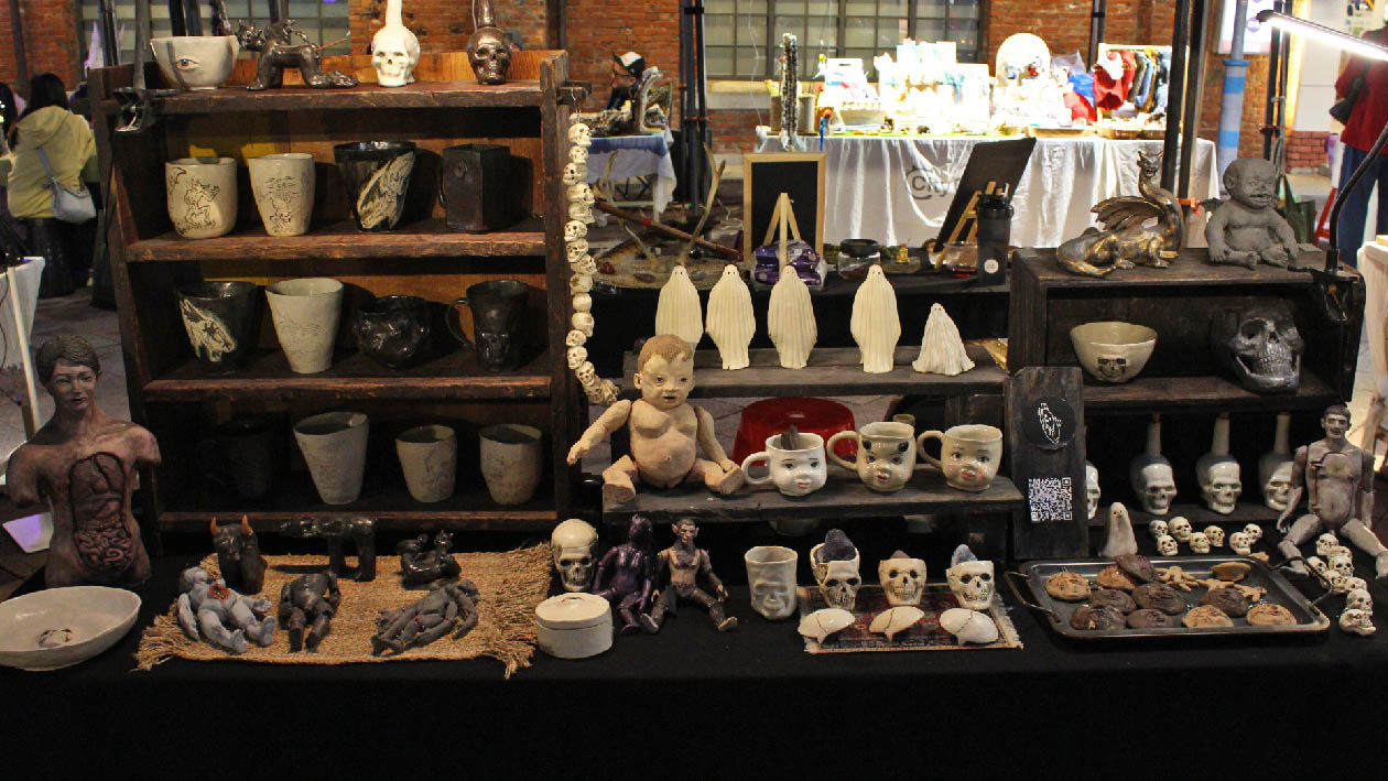 黑暗不足地獄商店陳列紀錄,作品加上陳列道具的重量讓桌板有些凹陷。(新富有樂市2025/09/06-07舉辦的艋舺靈界市)